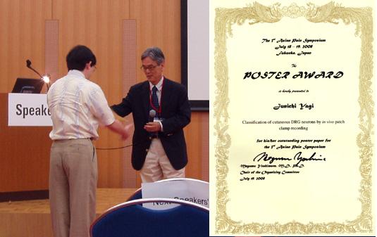 本シンポジウムは、痛みの基礎研究と臨床を結びつけ、その成果を日本、中国、韓国を中心としたアジアから世界に向けて発信しようと2001年に京都で立ち上がったもので、この中で医学部統合生理学教室の八木淳一講師が The Poster Award(ポスター賞)を受賞しました。このポスター賞とは、研究内容をパネルに掲示し他の研究者と直接意見交換しながら研究発表を行い、これにより審査員から高い評価を受けた発表に対して授与されるものです。