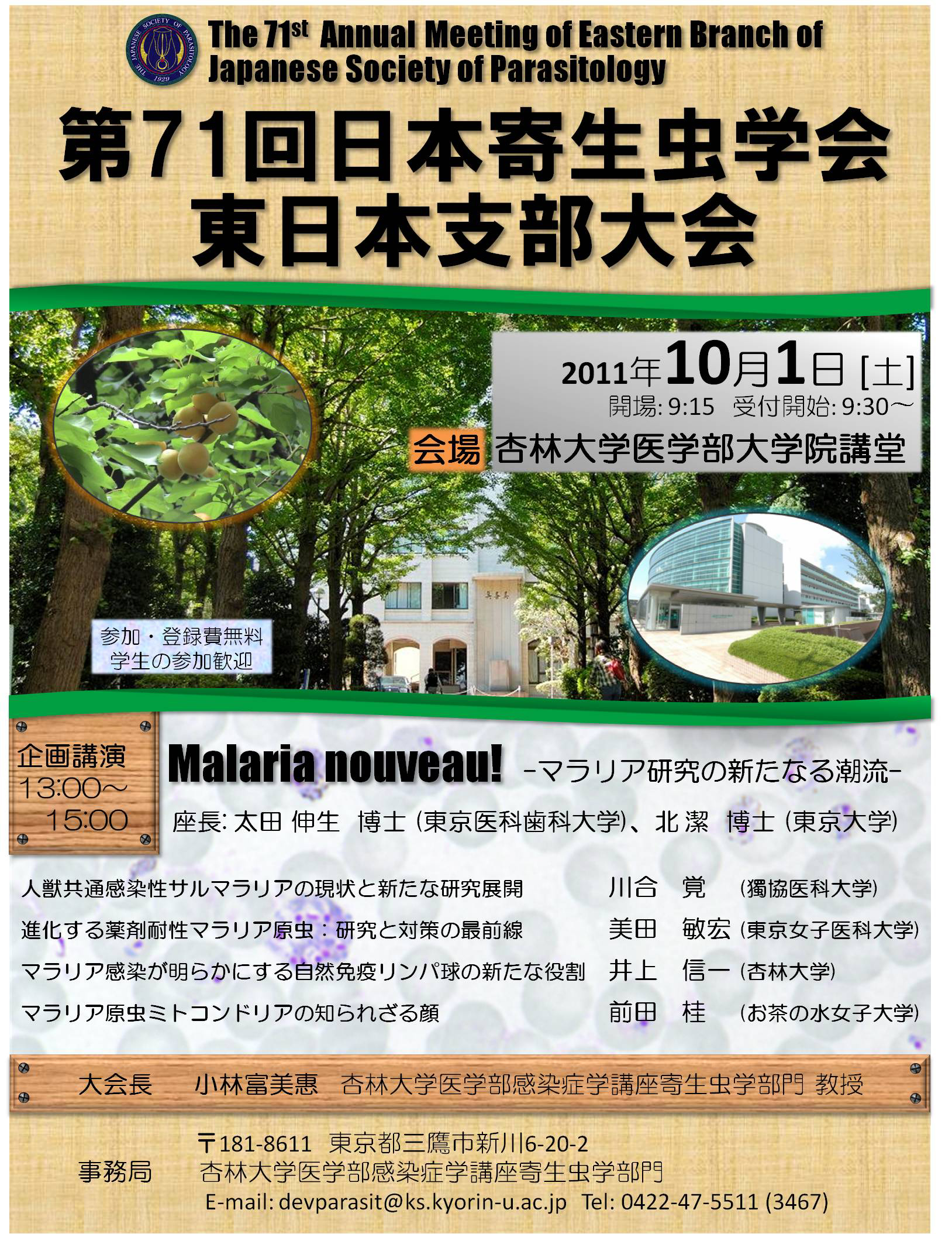 平成23年10月1日(土)午前10時より、本学医学部感染症学講座寄生虫学部門の主催で「第71回日本寄生虫学会東日本支部大会」を下記の要領にて開催いたします。