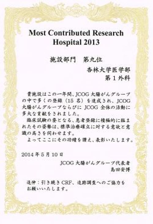 2014年5月、本邦のがん臨床研究・治療におけるリーダー的グループである日本臨床腫瘍グループ(通称JCOG:Japan Clinical Oncology Group)の大腸がんグループにおきまして、杏林大学が登録症例数トップ10に入り表彰を受けました。本邦では、医学の進歩に重要なエビデンス構築のための臨床研究が2000年以降盛んになり、欧米に引けを取らない多数症例での前向き無作為試験(ランダム化臨床試験)もすでに珍しいものではありません。これらの研究結果は、各がん腫における治療ガイドラインの構築や改訂に不可欠なものとなっています。JCOGグループは、国立がん研究センターが中心となり、本邦の主だった多くの施設が参加しています。消化器がんに限らず、肺がん、血液リンパ腫、軟部腫瘍、乳がんなど16のグループがあります。その中でも大腸がんは患者数が多く、2002年からJCOG大腸がんグループとして活発に活動を行っています。本グループはJCOGグループの中で参加施設数が最も多く(凡そ60施設が参加)、これまでも重要な研究成果を報告してきました。進行大腸癌の腹腔鏡手術適応に関する研究(JCOG0404)や進行直腸癌における側方リンパ節郭清の意義に関する研究(JCOG0212)などは世界に発信できる研究として最終結果が待たれているところです。杏林大学が今回受賞できた背景として、本教室が初年度から積極的に参加してきたことがあげられます。すでに12年を経過した現在も継続的に症例の登録を行っており、こうした継続性が今回の受賞に結びついたと考えられます。