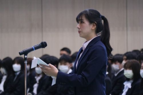 この後、在学生による歓迎の言葉に続いて、午前は保健学部の江島寛乃さんが、また午後は外国語学部の杉野葵唯さんがそれぞれ、変化の時代を共に歩む学生の縁を大切に、お互いを高め合える関係を築き、積極的に学びを深めていきたいと宣誓の言葉を述べました。