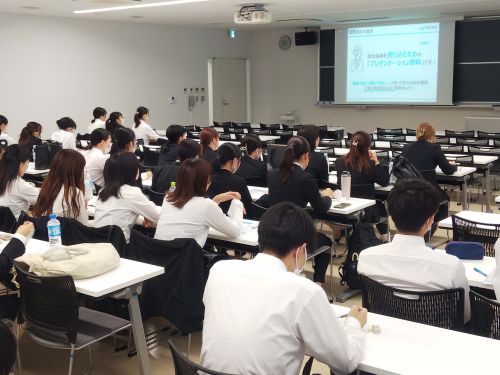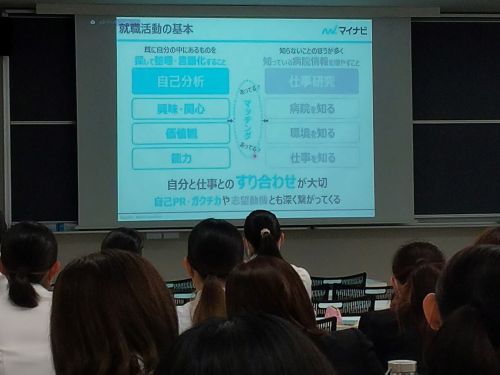 続いて、病院や福祉施設の採用担当者3人による講演が行われ、それぞれの業務内容や作業療法士の仕事について話を聞きました。学生からは経験を積むために同じグループの他の病院に移ることができるのかどうか、その際に希望は聞いてもらえるのかなど、就職先の選択に向けた具体的な質問が出ていました。