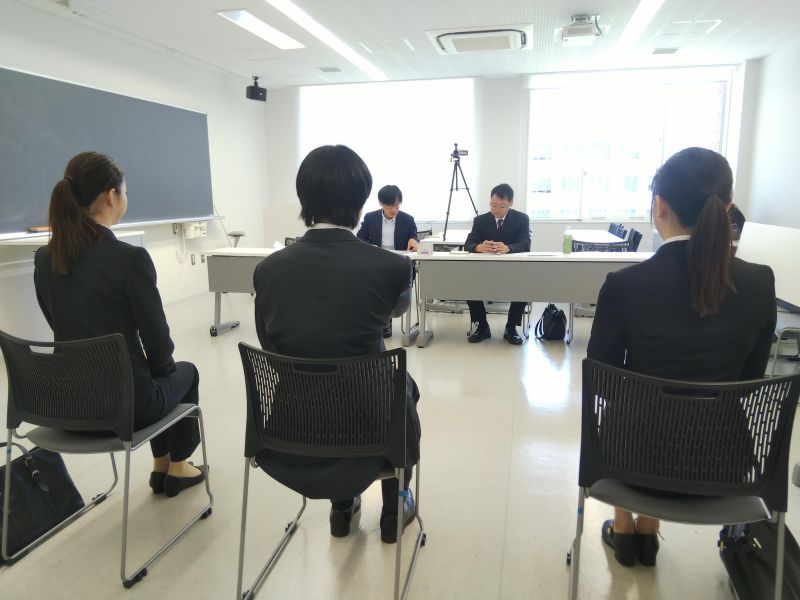このうち学生が3人一緒に面接に臨む集団面接では、実際に企業で採用面接にあたっている人事担当者が面接官を務め、学生から提出されたエントリーシートをもとに、学生時代に力を入れたことや調子が悪い時の乗り切り方などを質問しました。学生たちは緊張しながらも真剣に答えていましたが、集団での模擬面接は体験する機会が少ないだけに、戸惑う場面も見られ、面接後のフィードバックでは、一人一人の回答時間は長くないので要点を絞って答えると良いとか、他の学生が答えている時も、ちゃんと聞く姿勢が必要だなどとアドバイスを受けていました。