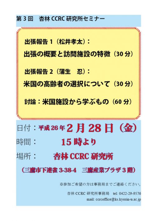 平成26年2月28日(金)、三鷹産業プラザ309杏林CCRC研究所で第3回杏林CCRC研究所セミナー「新しい都市型高齢社会における地域と大学の統合知の拠点 〜米国出張報告〜」が開催された。