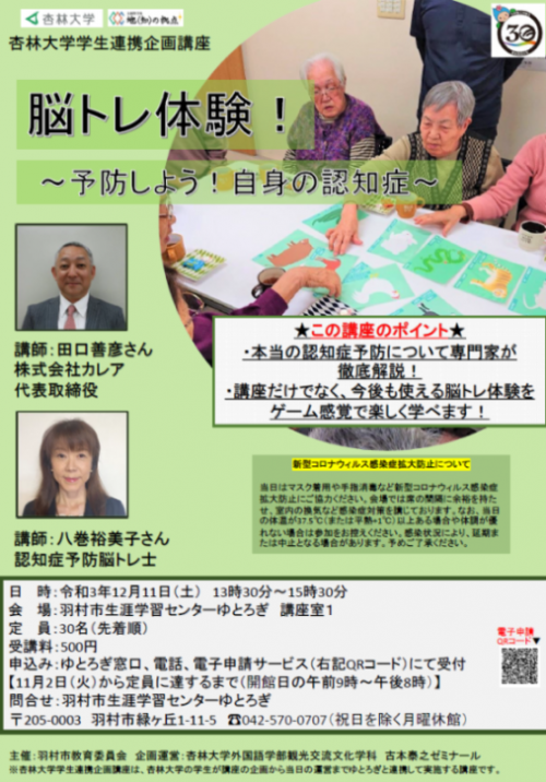 羽村市生涯学習センター「ゆとろぎ」と外国語学部観光交流文化学科 古本泰之ゼミの学生が連携し、「脳トレ体験!~予防しよう!自身の認知症~」と題した企画講座を実施します。この機会に脳のアンチエイジングにチャレンジしてみませんか?お申込みをお待ちしております♪♪
