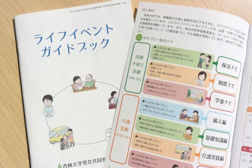 出産・子育て・介護といったライフイベントに関わる制度や情報を1冊にまとめた『ライフイベントガイドブック』を発行しました。男女共同参画推進室、総務部人事課にて配布しております。また、男女共同参画推進室のホームページの「出産子育て支援ナビ」、および「介護支援ナビ」においても情報を発信しています。こちらも合わせてご活用ください。