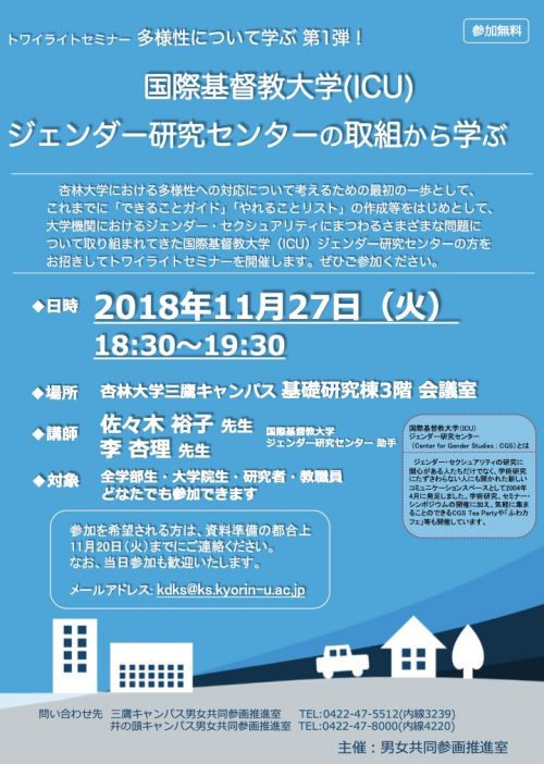 杏林大学における多様性への対応について考えるための最初の一歩として、これまでに「できることガイド」「やれることリスト」の作成等をはじめとして、大学機関におけるジェンダー・セクシュアリティにまつわるさまざまな問題について取り組まれてきた国際基督教大学(ICU)ジェンダー研究センターの方をお招きしてトワイライトセミナーを開催します。ぜひご参加ください。
