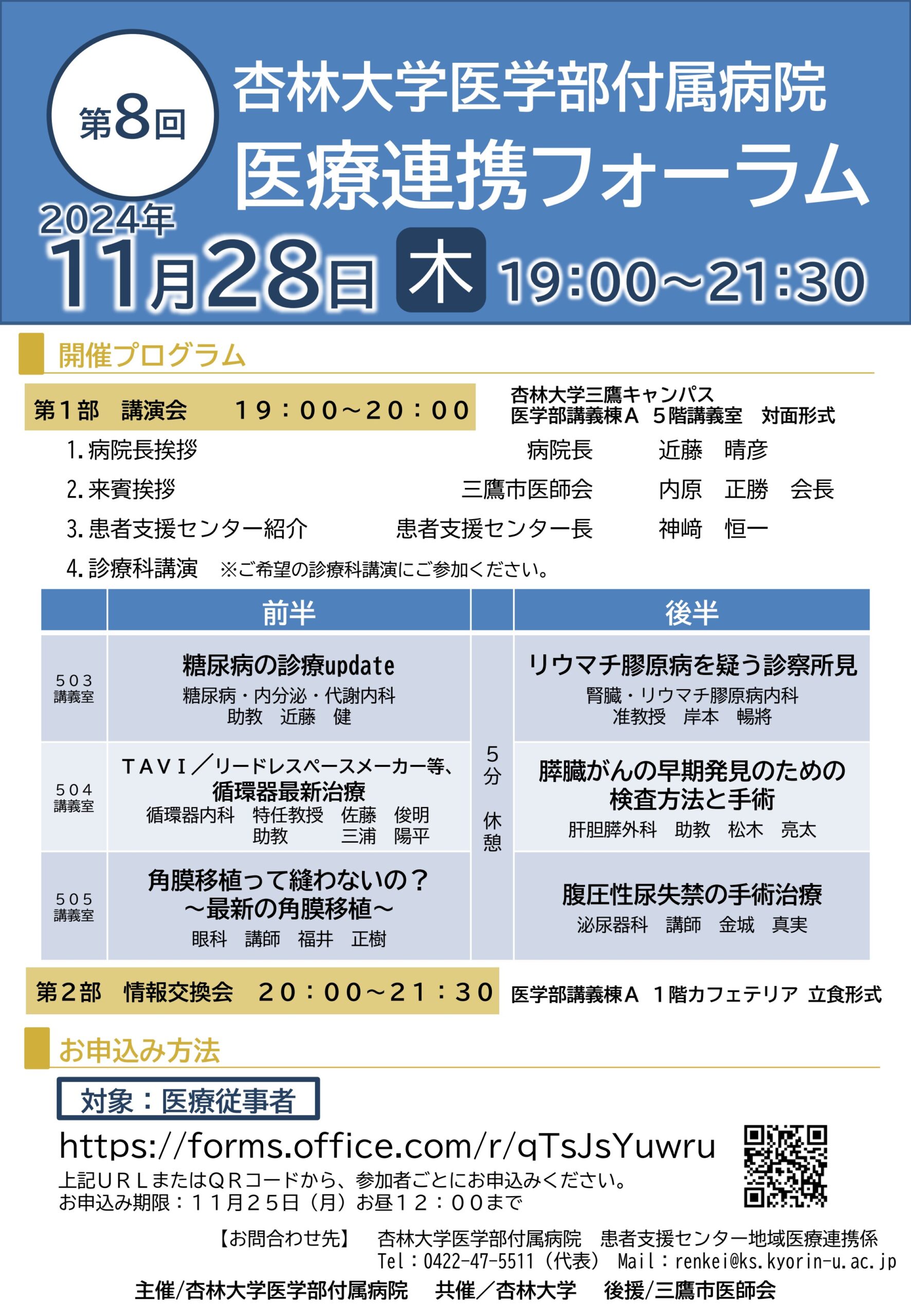 11/28(木)医療従事者対象 第8回杏林大学医学部付属病院 医療連携フォーラムのご案内 作成日時:2024年11月07日 医療関係者 当院では地域の医療従事者の皆様との連携をより一層深めるため、医療連携フォーラムを開催しています。皆様のご参加をお待ちしております。 ※事前申込制※対象:医療従事者申込みは【こちら】 一覧 病院からのお知らせ一覧 講演会・行事等一覧 医療関係者向けのお知らせ一覧