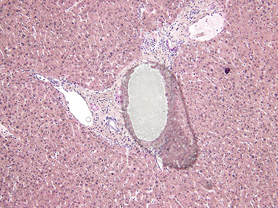 脱水が不完全のまま透徹封入した標本で、中央に水滴が認められる。