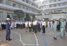 本部・病院地区・学校地区の自衛消防隊員は非常放送と同時に防災センターに集まり、部隊編成をした後、センタープラザでの初期消火訓練や給食訓練に臨みました。