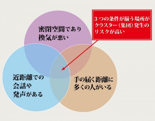 現在の新型コロナウイルスの拡散状況をみますと、クラスター感染とよばれる不特定多数への感染が報告され、TV等で報道されています。このクラスター感染は「換気が悪い場所」、「人が密に集まって過ごす場所」、「不特定多数の人が接触する場所」などが特に危険とされており、具体的にはスポーツジム、ビュッフェスタイルの会食、ライブハウス、屋形船等が挙げられています。