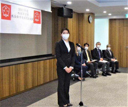 外国語学部の学生を対象とする2021年度外国語学部熊谷奨学生に、英語学科2年生の阿久津紗矢さん、1年生の板山理愛さんが決まり、1月13日に2021年度外国語学部熊谷奨学金採用伝達式を行いました。