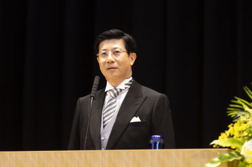 続いて、式辞に立った松田剛明理事長は、「在学中に取り組んでほしい3つの柱として、自分の力だけで判断し解決する力が養われる海外での経験を積むこと。学業以外に課外活動、とりわけスポーツに取り組むこと。そして、他の人には決して真似のできない自分だけのオリジナリティーを確立することをあげ、これらを通して広く世界に挑戦する人材に育ってください」と激励しました。