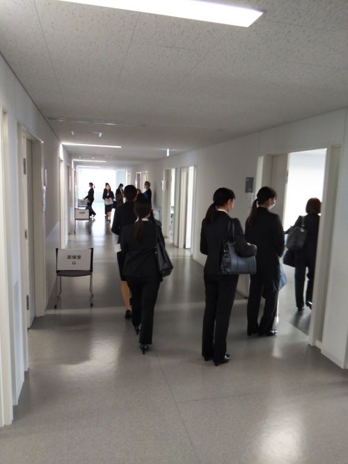 就職の選考過程でポイントとなる面接やグループディスカッションについては、既に授業の中で練習を重ねていますが、11月26日の「就活シミュレーション」は、会社に集合してから面接、グループディスカッションを経て解散するまでの選考過程の一日を疑似体験することで、就職活動への対応力をつけてもらおうと行われました。外国語学部の3年生全員が対象で、本番を想定してリクルートスーツを身につけ、リクルートバッグを持って臨みました。