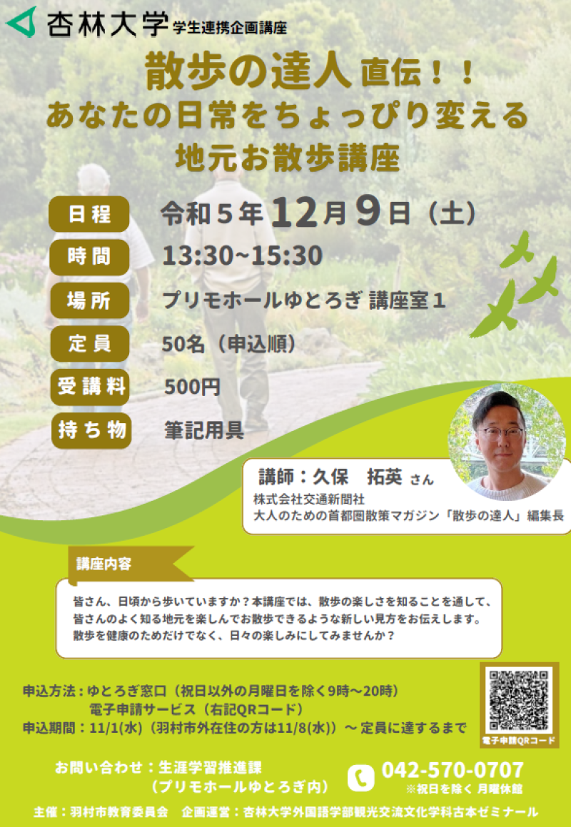 12月9日(土)羽村市にあるプリモホールゆとろぎを会場に、観光交流文化学科の古本泰之ゼミナール生と羽村市とが連携して実施する企画講座「散歩の達人直伝!あなたの日常をちょっぴり変える地元お散歩講座」を行います。事前申し込みが必要になりますので、参加をご希望の方は添付チラシまたは下記を参照の上、羽村市生涯学習推進課にご連絡下さい。