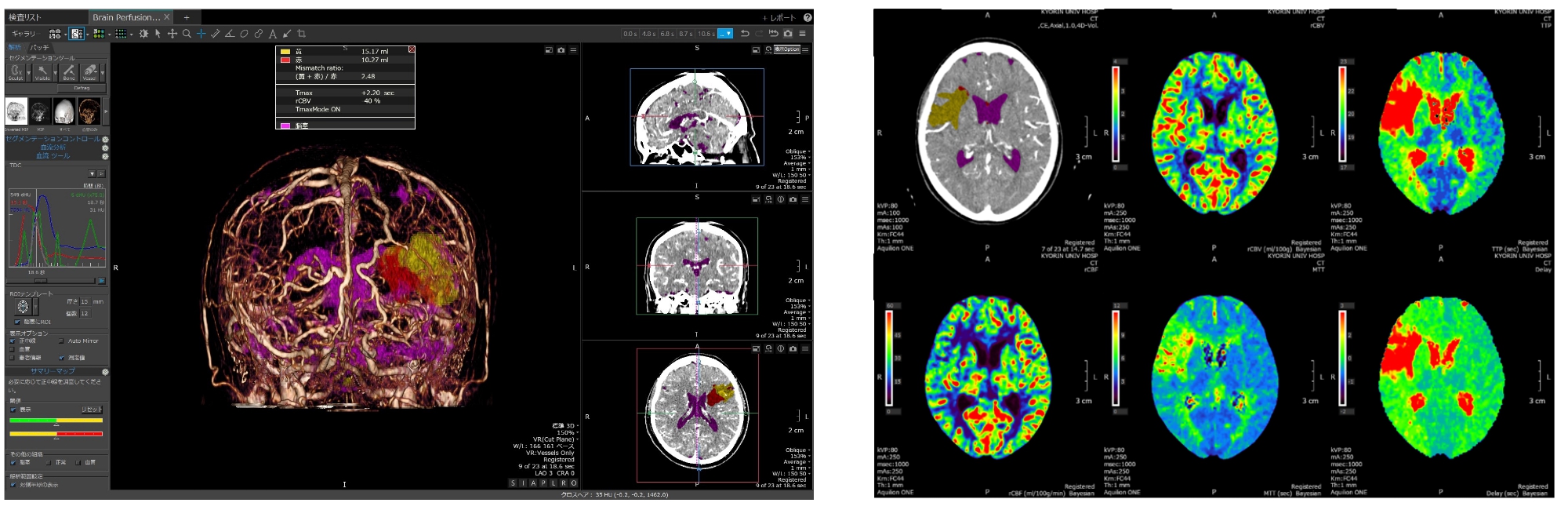 脳卒中患者さんに対する従来の検査方法はCTを撮影してからMRIを撮影し、確定診断をしていましたが、2019年に当院脳卒中センター、放射線部とキヤノンメディカルシステムズ株式会社とが共同で開始した研究により、CTのみで脳血管の梗塞部位を特定することができるようになりました。