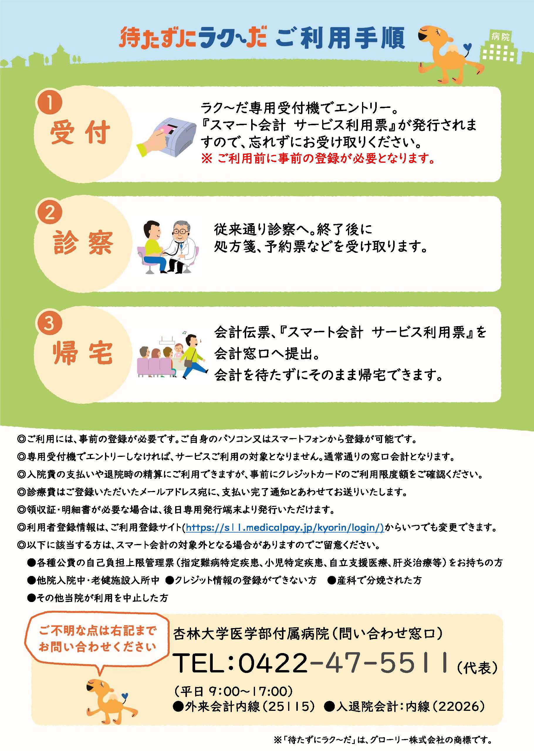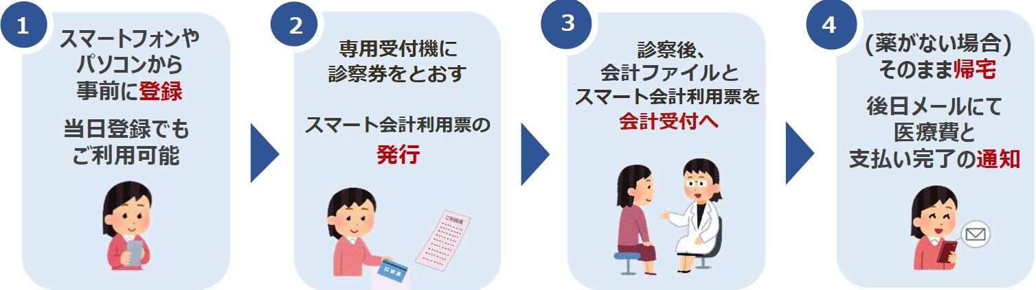 - <外来>来院時に専用受付機で受付をしてください。診察終了後、発行された「スマート会計利用票」と会計ファイルを『スマート会計専用窓口』にご提出ください。