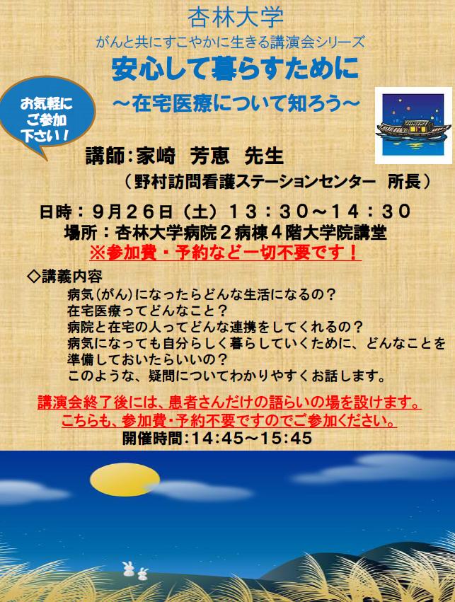 9/26「がんと共にすこやかに生きる」第4回講演会~講演会と語らい~のご案内 作成日時:2015年09月08日 講演会・行事等 年間の講演会情報はこちらから 一覧 病院からのお知らせ一覧 講演会・行事等一覧 医療関係者向けのお知らせ一覧