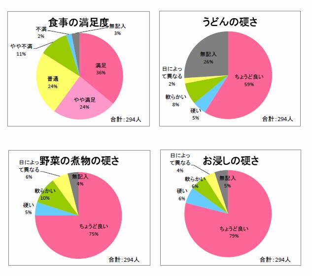 今回の嗜好調査は、病院食の満足度と、病院食の硬さについて、「うどん」、「野菜の煮物」、「お浸し」の3つの項目別に調査を実施致しました。