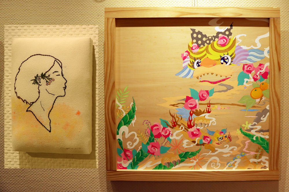 会場には、日本画やアクリル画、刺繍、切り絵、水彩画など多彩な手法で制作された個性豊かな作品28点と、代表者の直平さんの剪画2点、あわせて30点が展示されています。