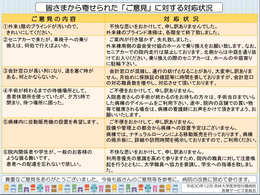 皆さまから寄せられた「ご意見」に対する対応状況 2018 作成日時:2018年12月10日 お知らせ 貴重なご意見をありがとうございました。今後も皆さんのご意見等を参考に、病院の改善に努めて参ります。 杏林大学医学部付属病院 医療サービス委員会 *クリックするとPDFが開きます。 一覧 病院からのお知らせ一覧 講演会・行事等一覧 医療関係者向けのお知らせ一覧