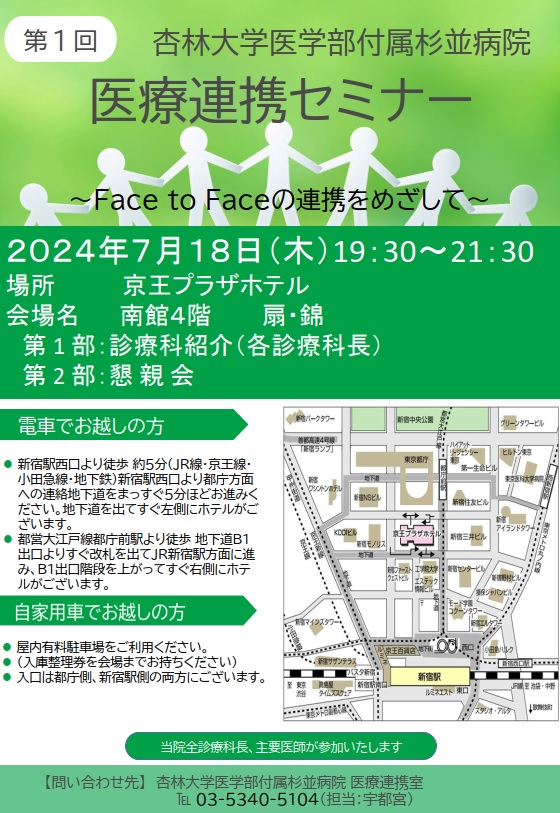 杏林大学医学部付属杉並病院では、医療機関の皆さまとの連携拡充を目指して、医療連携セミナーを開催いたします。