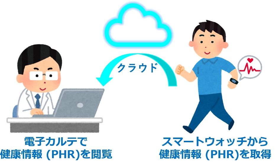 このたび新たに開設する次世代型スマートウォッチ外来では、スマートフォンやスマートウォッチに蓄積された健康情報(PHR)をクラウドを通じて活用し、日常の診療に役立てる新しい取り組みを行います。