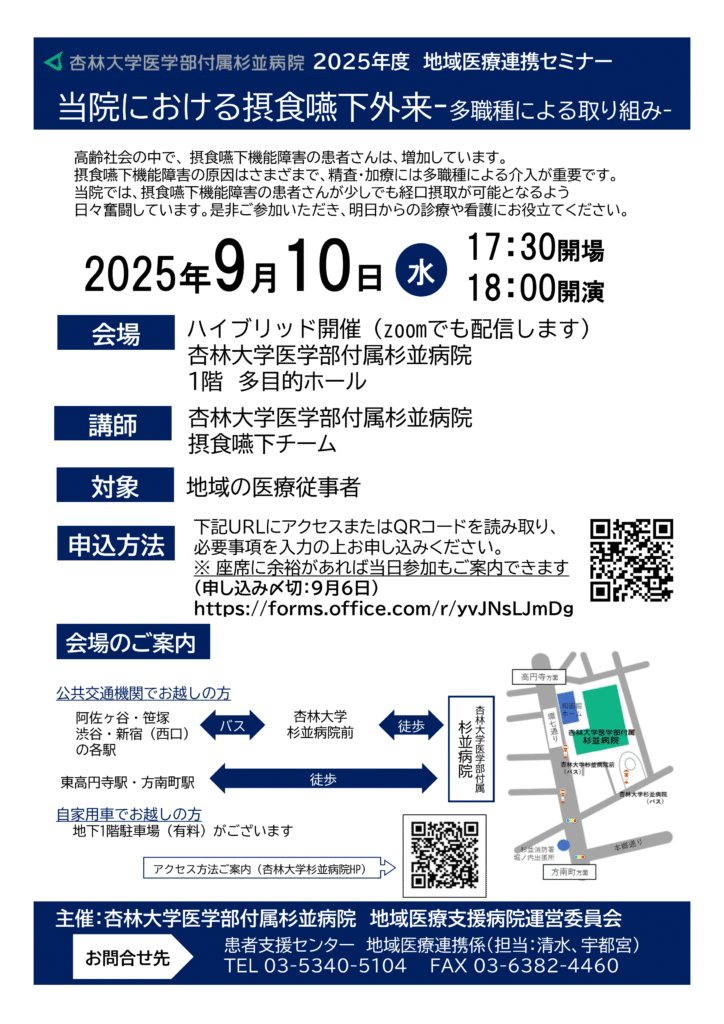 9月10日(水)地域医療連携セミナー「当院における摂食嚥下外科」のご案内 作成日時:2025年08月20日 下記の日程で地域医療連携セミナーを開催します。皆さまのご参加をお待ちしております。申込み:【こちら】から 病院からのお知らせ一覧 講演会・行事等一覧 医療関係者向けのお知らせ一覧