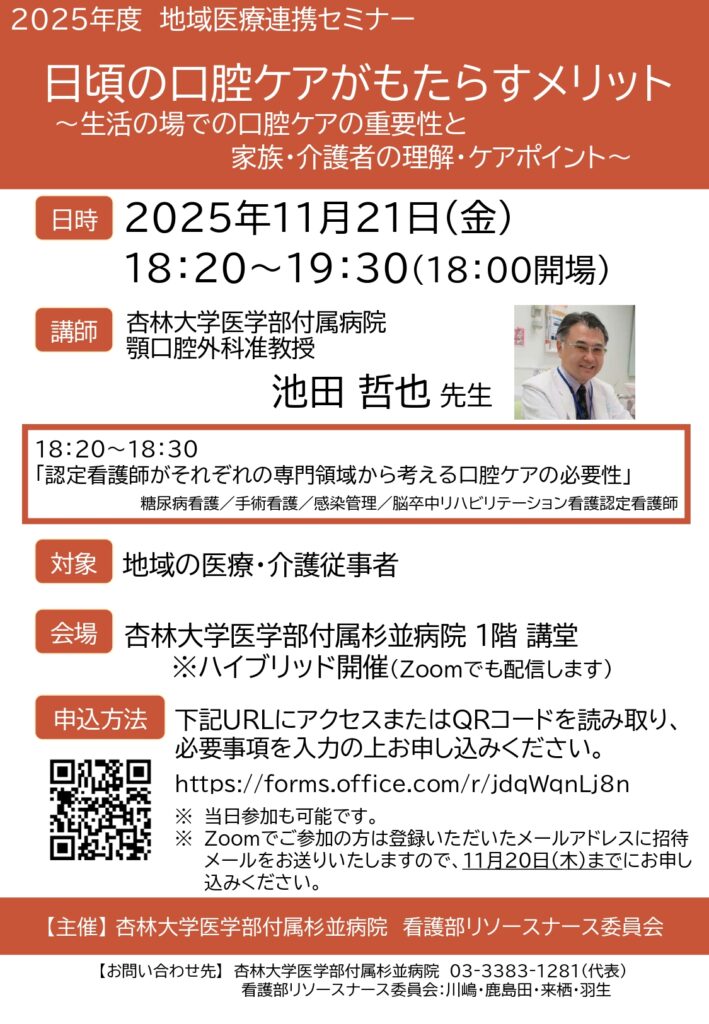 11月21日(金)地域医療連携セミナー「日頃の口腔ケアがもたらすメリット」のご案内 作成日時:2025年10月08日 下記の日程で地域医療連携セミナーを開催します。皆さまのご参加をお待ちしております。申込み:【こちら】から 病院からのお知らせ一覧 講演会・行事等一覧 医療関係者向けのお知らせ一覧