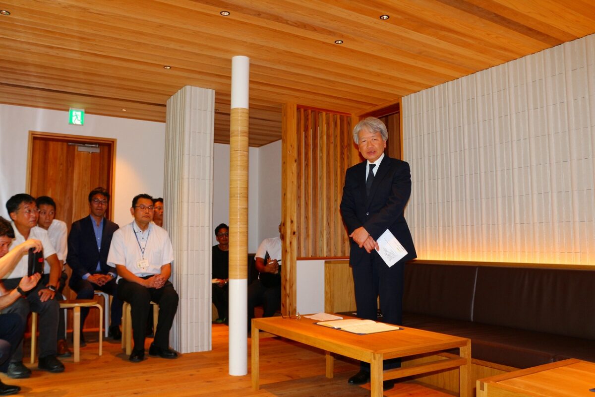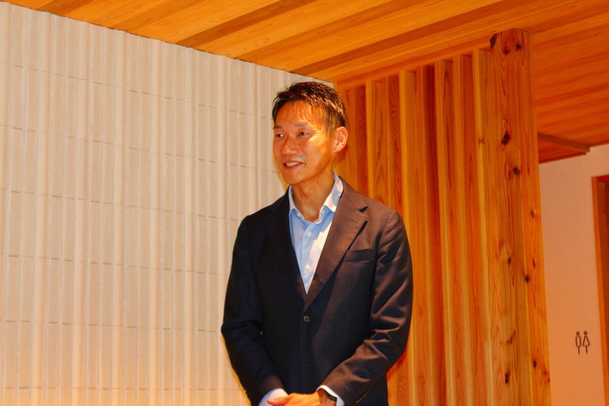 沿線まるごと株式会社田治米取締役の挨拶では、青梅線沿線(青梅駅〜奥多摩駅の東京アドベンチャーライン)における「沿線をまるごと楽しめるホテル」というコンセプトのもと、養魚場が残されていた古い空き家を改修して運営している宿泊施設「Satologue(さとローグ)」の紹介や、奥多摩町で進めている鉄道を活用した新しい形の地方創生プロジェクトが紹介されました。また、杏林大学の学生による庭の整備や実証実験への協力、今年11月に予定されている奥多摩町70周年イベント、さらに2040年までに30拠点の整備を目指すという今後の展望についても言及されました。