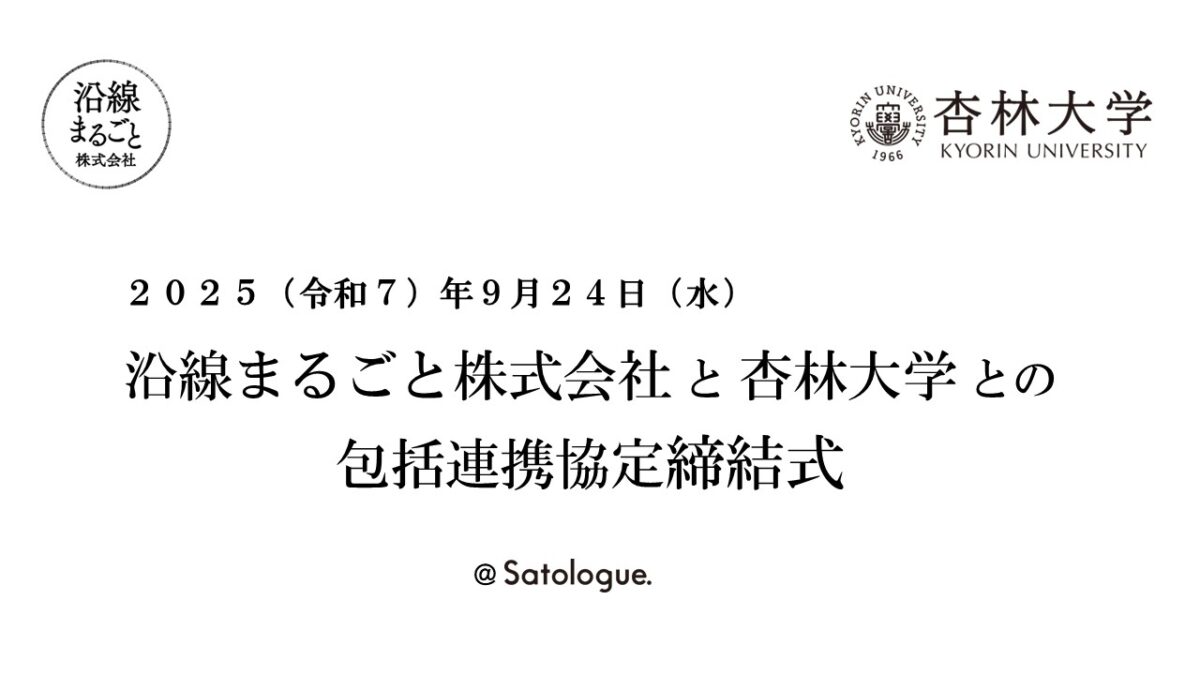 2025(令和7)年9月24日(水)、杏林大学(東京都三鷹市新川6-20-2)と沿線まるごと株式会社(東京都西多摩郡奥多摩町棚澤390)は、同社が所有・運営するレストラン棟「Satologe.(さとローグ)」にて、包括的連携協定を締結いたしました。