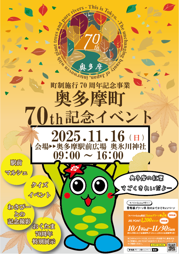 奥多摩町は、2025年に町制施行70周年を迎えました。これを記念し、奥多摩駅前広場および奥氷川神社にて「奥多摩町70th記念イベント」が開催されます。