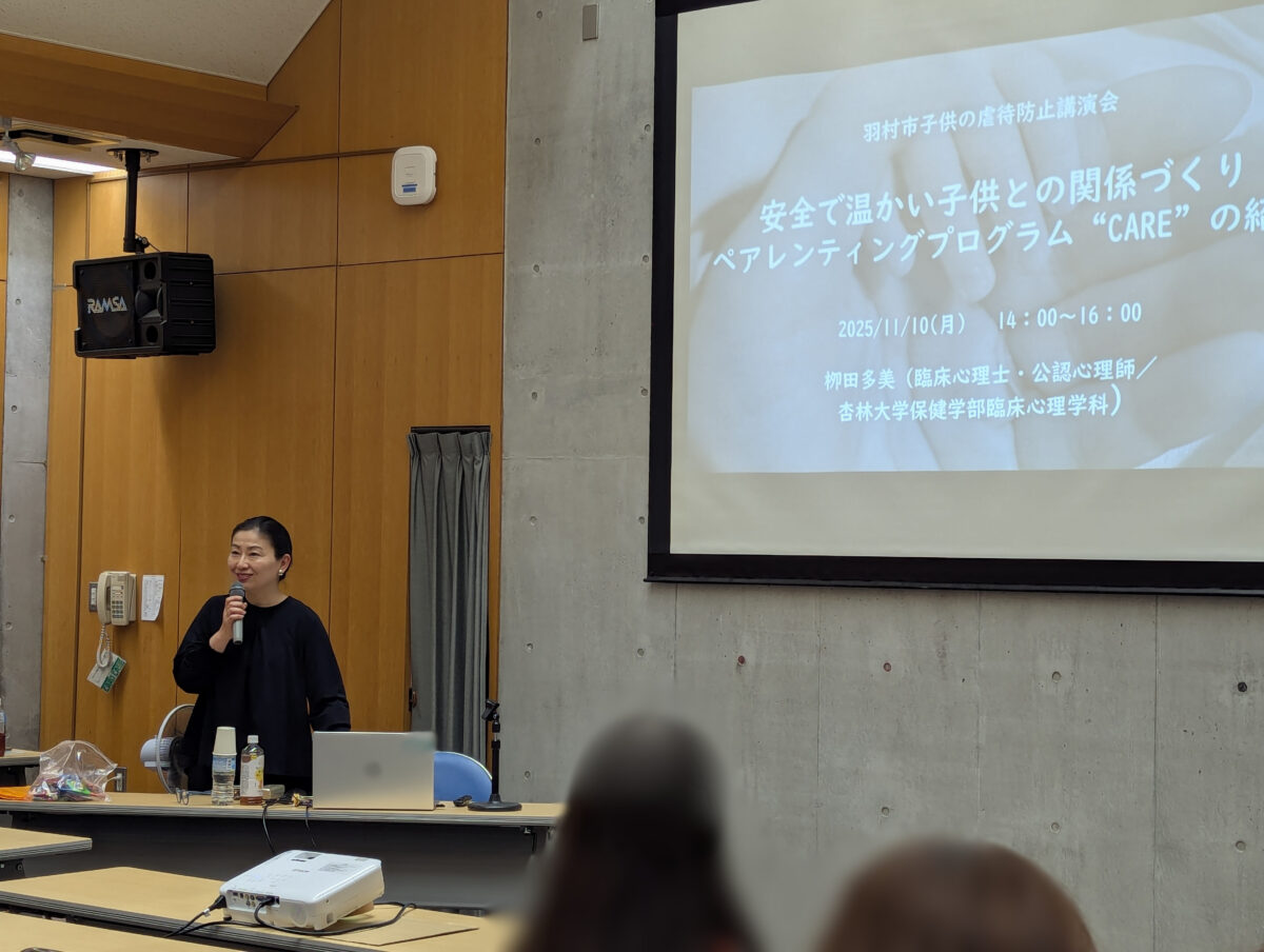 2025(令和7)年11月10日(月)羽村市福祉センターにて、『子供の虐待防止講演会「安全で温かい子供の関係づくり~ペアレンティングプログラム”CARE”の紹介~」』が開催されました。