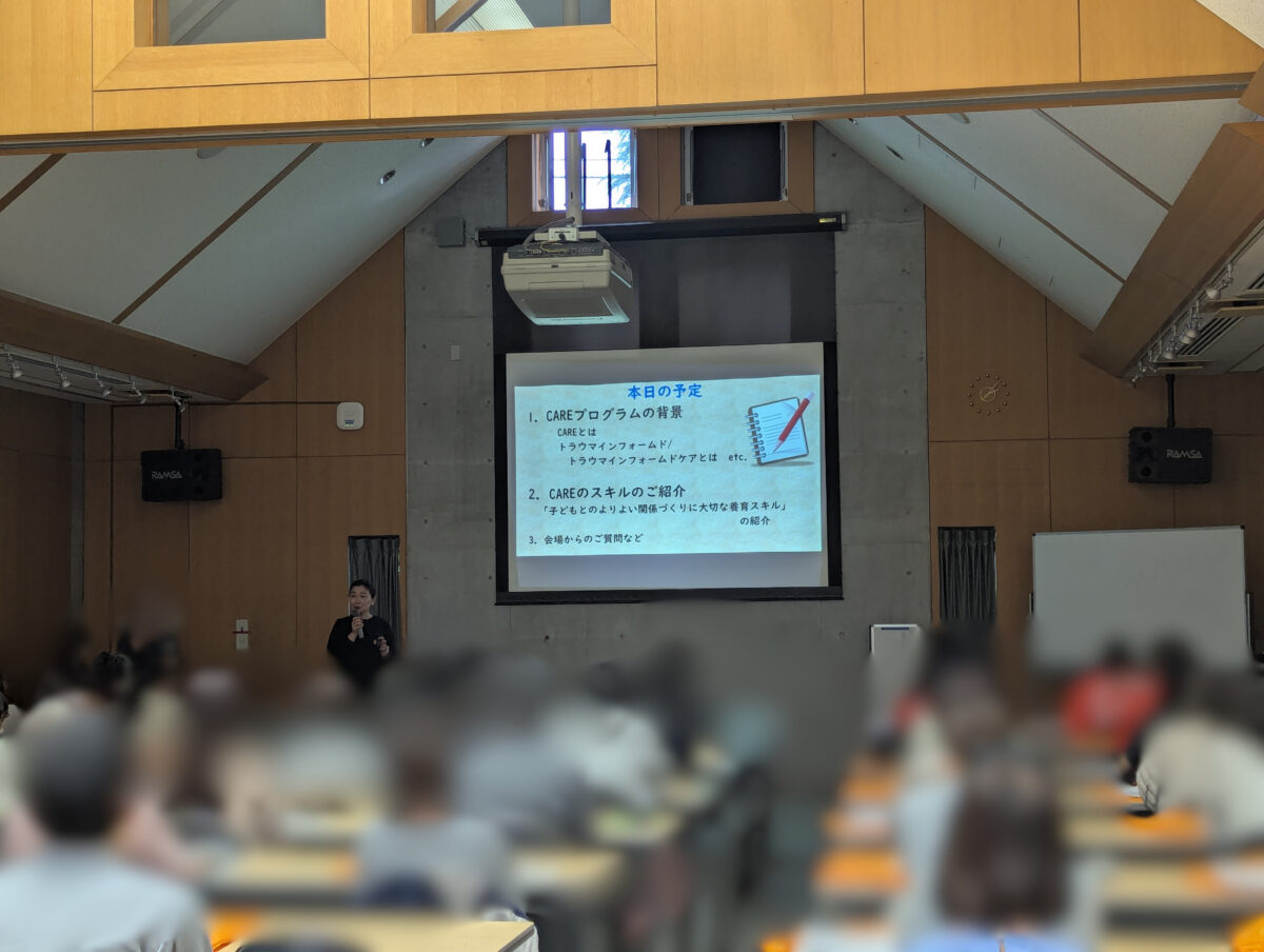 続いて、「CARE」のスキルや考え方について、具体的な解説を交えながら講話が進められました。今回は正式なワークショップではないため、プログラムの背景にある根拠などの紹介にとどまりましたが、「なぜ体罰は“使う側”が依存しやすいのか」といった、大人が日常で陥りがちな子どもとの接し方の問題点について、その心理的な理由と子どもへの影響について深く掘り下げてお話がありました。