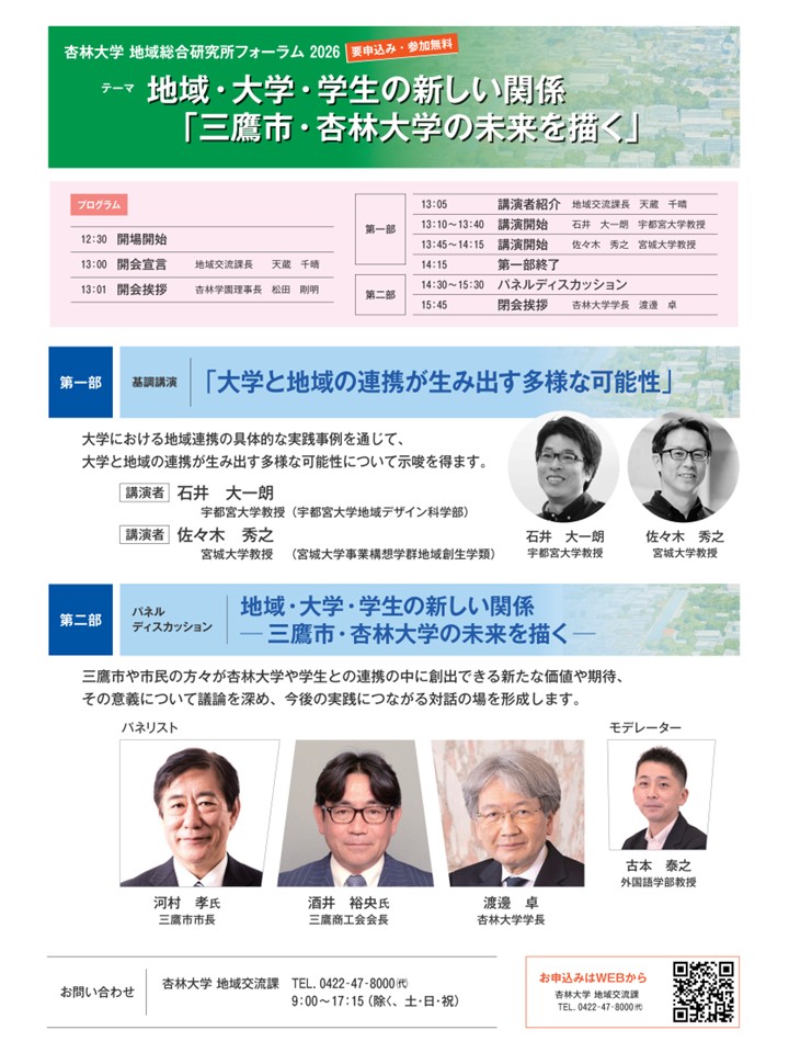 杏林大学地域総合研究所は、2026(令和8)年3月28日(土)13時00分より、本学井の頭キャンパス A棟1階 A101講義室にて、