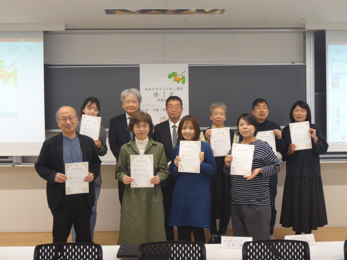 「この講座は、本学の学びを地域の皆さんに知っていただく大切な機会です。開講にあたっては地域連携センターを中心に、関係教職員が本学の特徴を活かしつつ、多くの社会人の皆さんに受講いただけるテーマや受講スタイルを模索しながら準備を進めてきました。今回いただいたご意見を真摯に受け止め、良かった点はさらに伸ばし、課題は改善できるよう努めます。皆さんは無事修了されたことで、本学の卒業生です。今後も本学に愛着を持っていただき、ご縁がありましたらまた本学の学びに触れていただきたいと思います。」