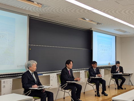 各パネリストより大学・地域・商工会が持続的に協力できる制度設計、受け入れ基盤の整備、定期的な方針確認の重要性について意見、提案がありました。また、渡邊学長より、第1部に登壇した石井教授、佐々木教授にコメントをお願いする場面もあり、活発ながら和やかな雰囲気で議論が進みました。