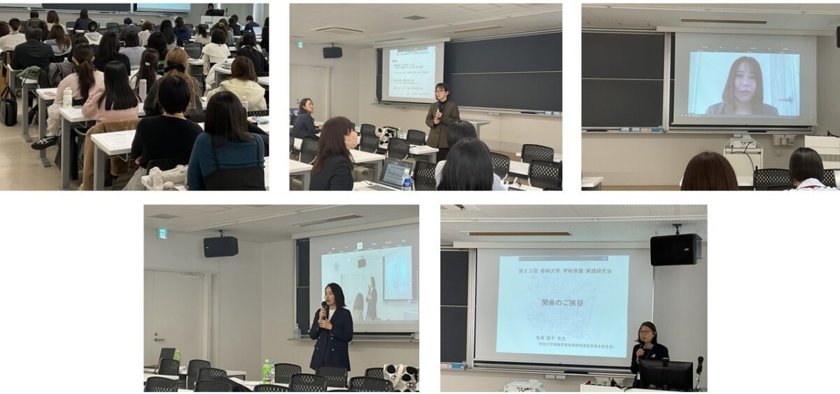 学校保健実践研究会は養護教諭教育(卒後・養成)の一環として毎年実施しており、今年は、昨年と同様にハイブリットでの開催となりました。会場には卒業生、一般の方、在学生、教職員の計78名の方がお越しくださいました。オンラインからの参加を含め、計110名の方にご参加いただき、盛況な会となりました。