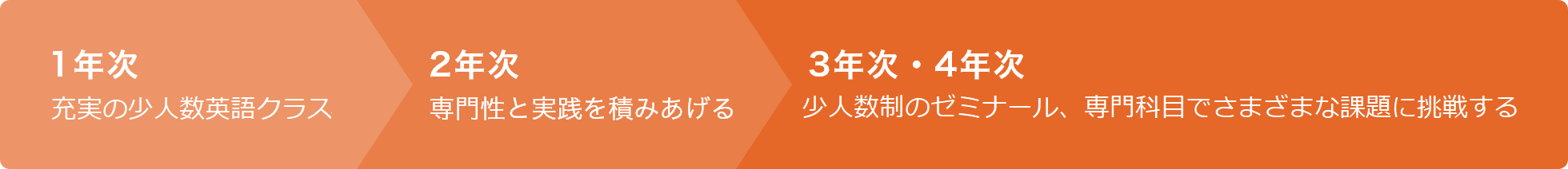 1年次に身につけた英語力をさらに飛躍させるための授業により、「使える・話せる英語」を身につけます。加えて専門性の高い学びで思考力を養っていきます。