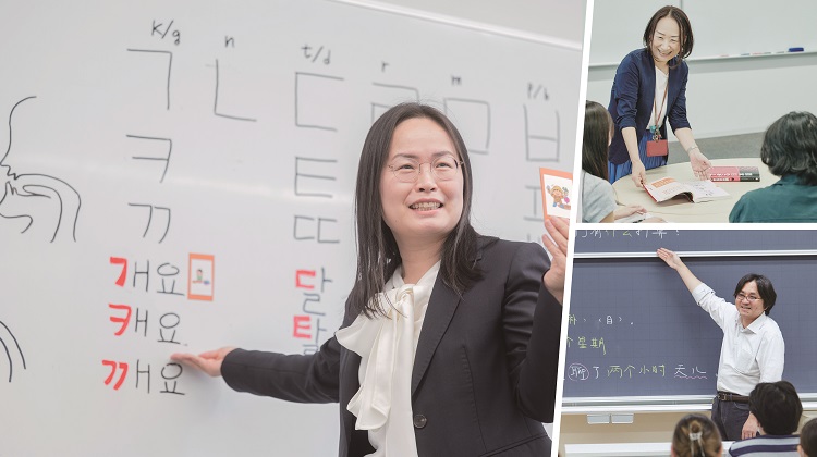 中国語コース・韓国語コースでは、週5回の演習を通して、それぞれの言語の発音・文法・語彙の基礎を身につけます。日本語・日本語教育コースでは、主要外国語である英語に加え、さらに1言語以上の外国語を学びます。