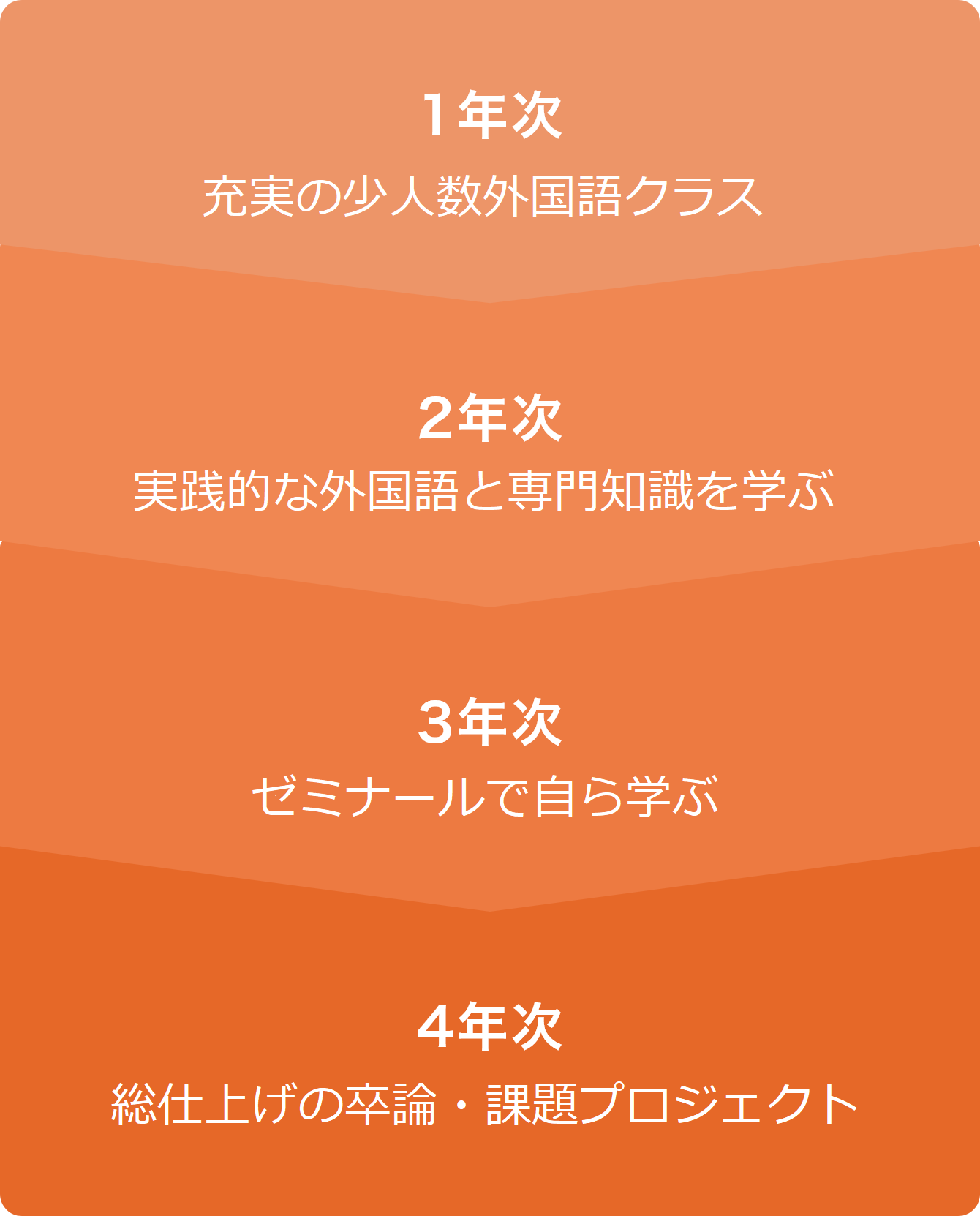 これまでに身につけた外国語力や専門知識、課題解決力を生かし、卒業論文や卒業課題プロジェクトに取り組みます。また、これまでの学びや取り組みを社会やキャリアにつなげていきます。