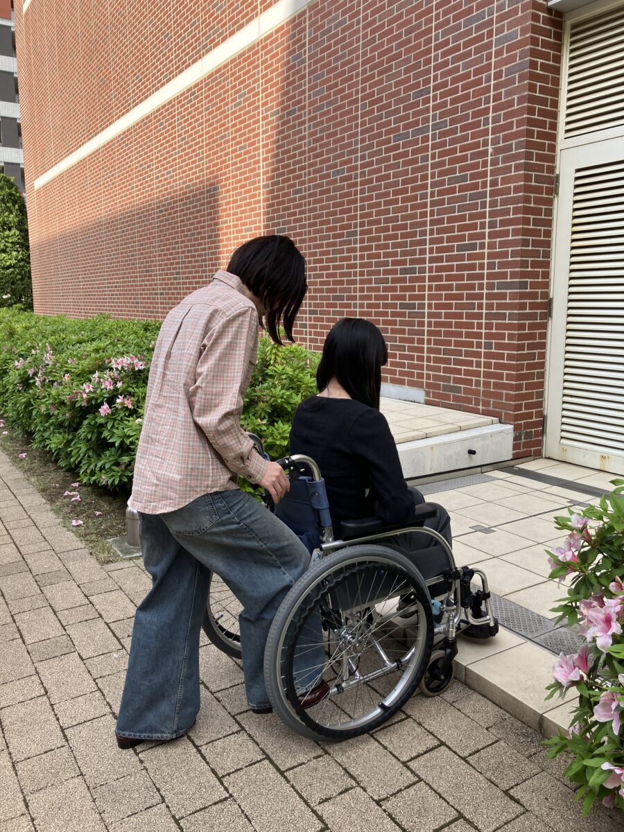 観光交流文化学科の専門科目「福祉観光論」は、高齢や障がい等の有無にかかわらず、すべての人が安心して楽しめる旅行であるユニバーサルツーリズムの現状と課題を学んだうえで、オリジナルのユニバーサルツアーを提案することを目標としています。 第3回、第4回の授業では、車いす利用者の方の介助、視覚に障害がある方への介助について実際に車いすや白杖を使い、サポートする側・される側それぞれを体験しました。井の頭キャンパスにはバリアーはほとんどありませんが、体験することでサポートする側・される側それぞれの視点で発見がありました。