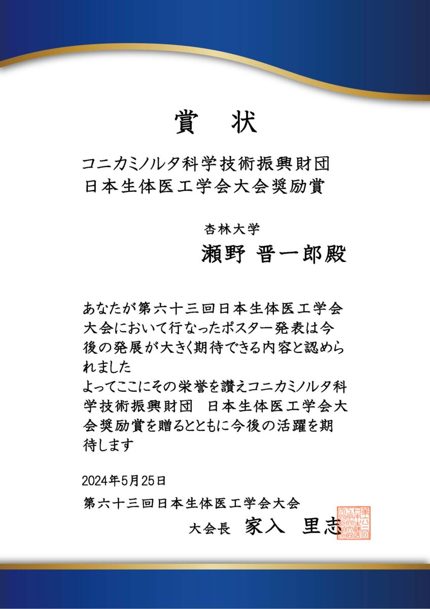 保健学部臨床工学科の瀬野晋一郎准教授が日本生体医工学会大会奨励賞を受賞しました。