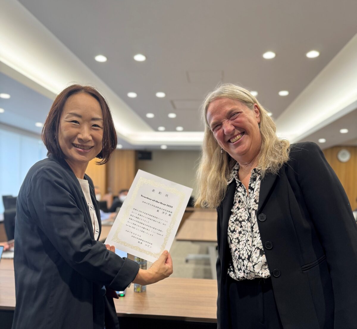2025年度春学期在学生のアンケート結果に基づいて、今回評価が高かったのは嵐洋子教授が[ Teacher of the Year 2025(春学期)]に選出されました。10月15日(水)に坂本ロビン国際協力研究科長より表彰が行われました。