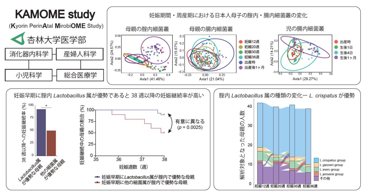 杏林大学(東京都三鷹市。学長:渡邊 卓)医学部の消化器内科学教室、産科婦人科学教室、小児科学教室、総合医療学教室からなる研究グループ(※)が、日本人妊婦において妊娠早期の腟内に乳酸菌の一種であるLactobacillus属(ラクトバチルス属)が多く存在することが良好な妊娠経過と関連することを初めて明らかにしました。