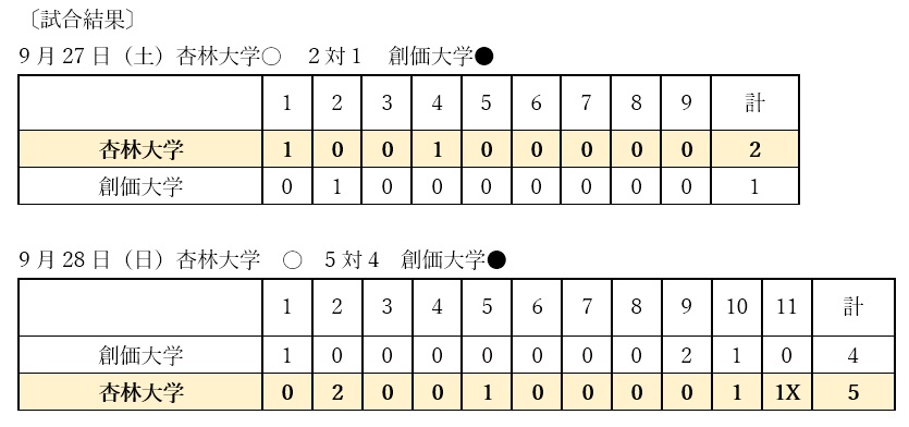 9月27日、28日に杏林大学 対 創価大学の試合が岩槻川通公園球場で行われ、1日目は2対1、2日目は5対4で杏林大学が2連勝しました。2日目は、杏林大学が3対1の2点リードで迎えた9回表に創価大学に2ランホームランで同点に追いつかれ、タイブレークに突入。10回に双方が1点ずつ得点し、11回裏に杏林大学が1点をもぎ取り5対4で勝利しました。