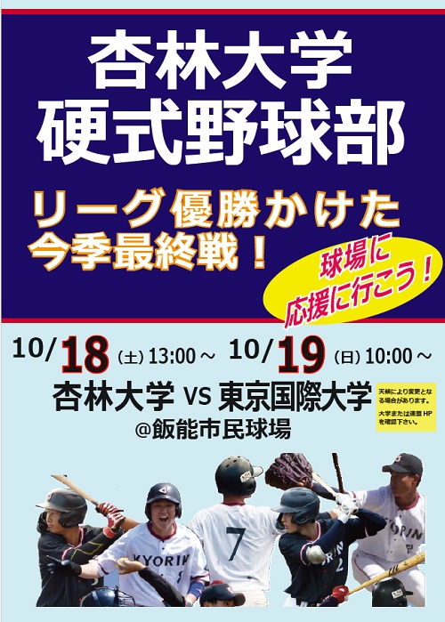 杏林大学硬式野球部が加盟する東京新大学野球連盟1部のR7年度秋季リーグ最終戦(対 東京国際大学)が10月18日(土)13:00~、19日(日)10:00~ 飯能市民球場で行われます。