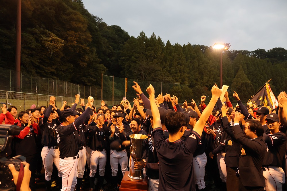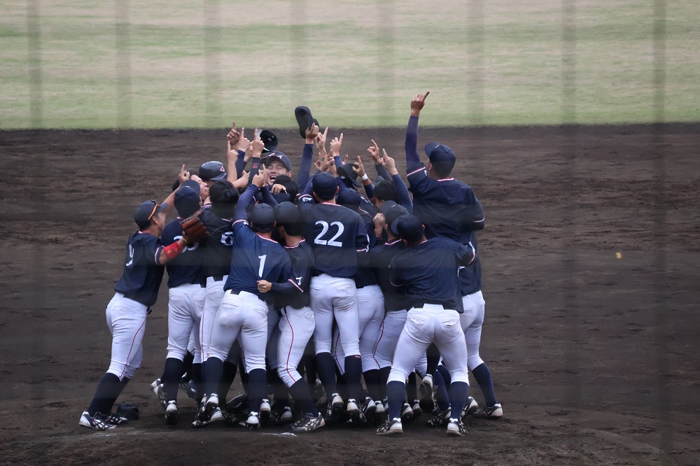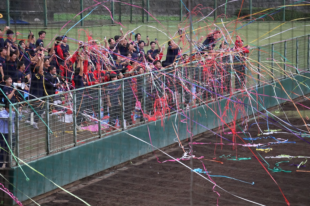 勝利を決めた瞬間、マウンドに駆け寄った選手たちに向かって、観客席から投げられた祝福の紙テープが宙を舞いました。創部40年を経て上りつめたリーグ初優勝。観客席には多くの野球部OBや関係者が駆けつけ、代々受け継いできた思いが溝口智成監督のもと実った瞬間を共に祝いました。