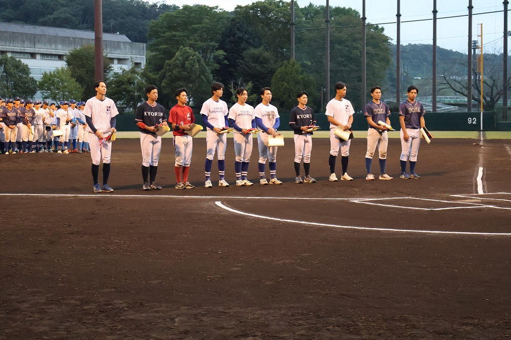 試合は両校が点を重ねる展開となりましたが、初回に4点をあげた杏林大学が東京国際大学の追い上げをかわし、勝利を手繰り寄せました。