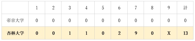 11月3日(月祝)、横浜市長杯争奪第21回関東地区大学野球選手権大会の2回戦が横浜スタジアムで行われ、杏林大学(東京新大学野球連盟1位)は帝京大学(首都大学野球連盟2位)に13対0で勝利し、本日 11月4日(火)の準決勝に進出しました。