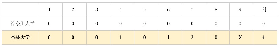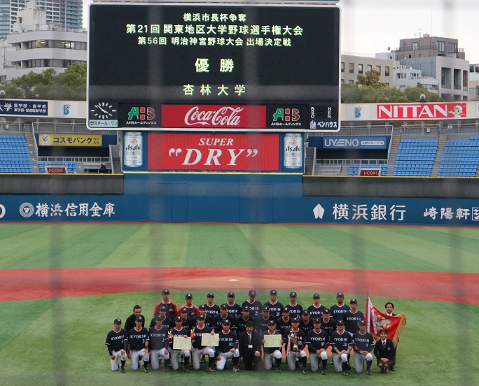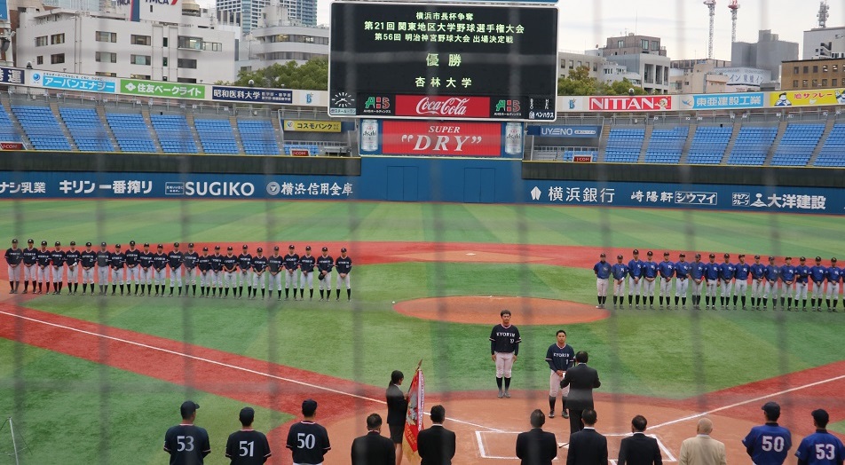 11月5日(水)、横浜市長杯争奪第21回関東地区選手権の決勝戦が横浜スタジアムで行われ、杏林大学(東京新大学野球連盟1位)は、神奈川大学(神奈川大学野球連盟1位)を4対0で破り初優勝を決めました。